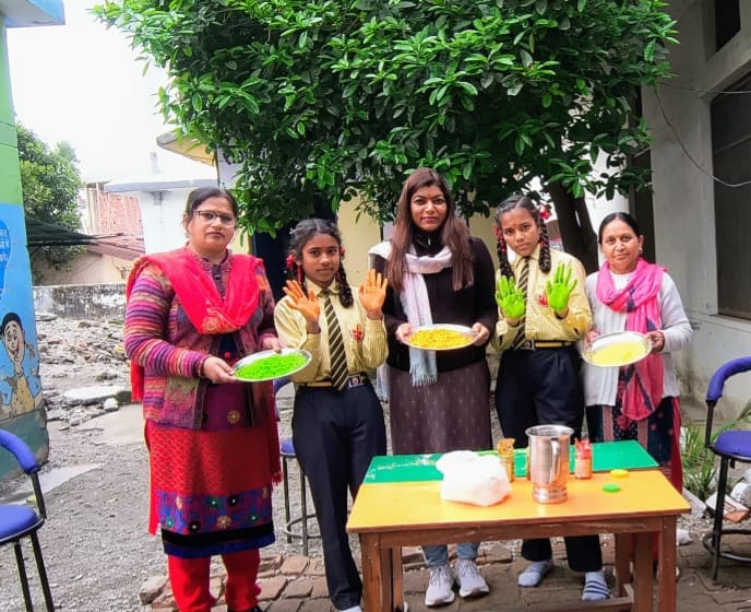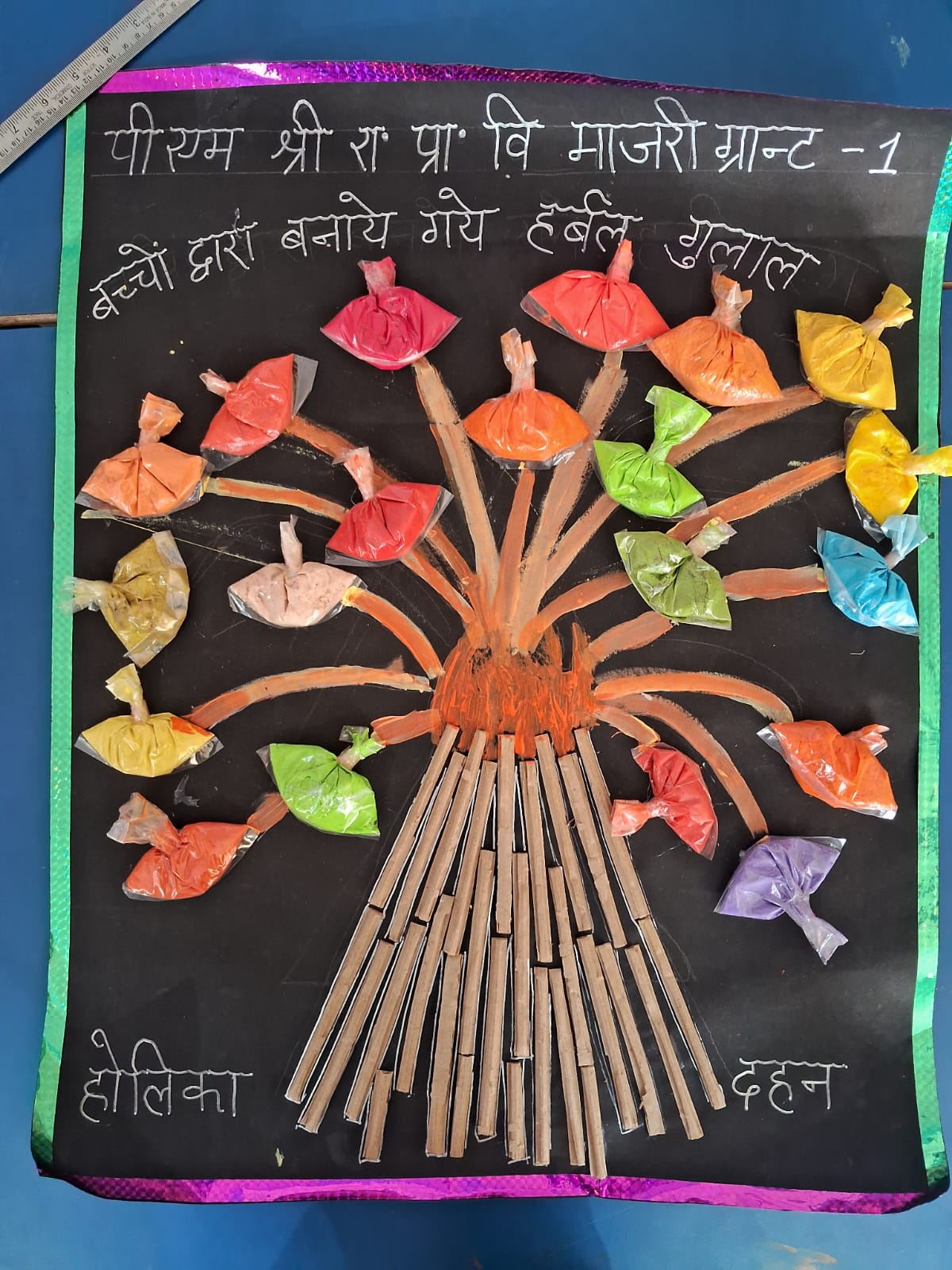 पीएम श्री राजकीय प्राथमिक विद्यालय माजरी ग्रांट 1 में अध्ययन कर रहे छात्र -छात्रों को विभिन्न प्रकार वस्तुओं से रंग बनाना सिखाया गया। बच्चों को फूड कलर व हर्बल कलर से होली मनाने के लिए प्रेरित किया गया।