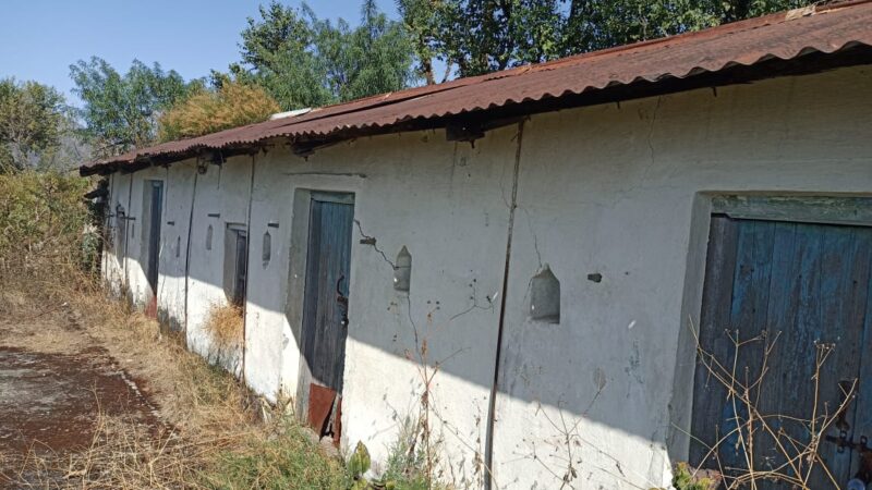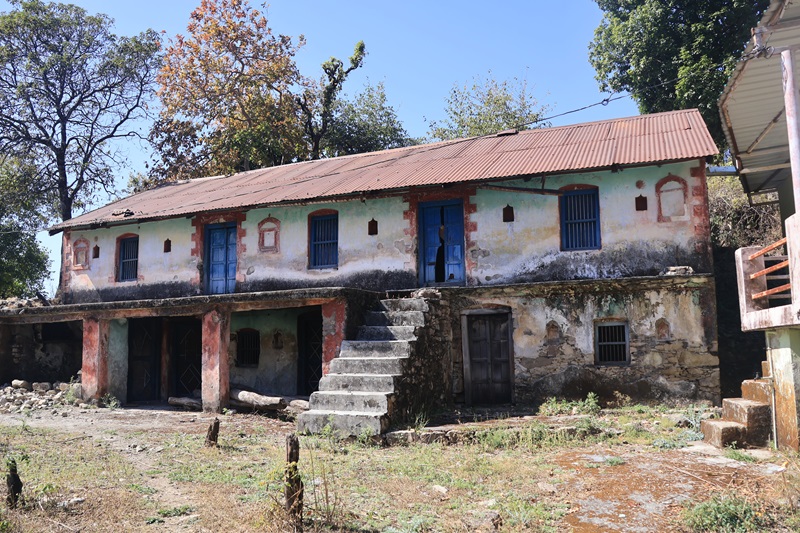हमें थोड़ा आगे एक और जर्जर भवन दिखाई दिया। हम वहां पहुंचे तो भवन के आंगन में झाड़ियां थी, शायद पहले यहां क्यारियां होंगी। वहां नल का स्टैंड भी लगा था, जो झाड़ झंकाड़ में नहीं दिख रहा था। कमरों पर ताले लटके थे। दोमंजिला मकान की छत ऐसी कि इस पर चढ़ते हुए डर लग रहा था।