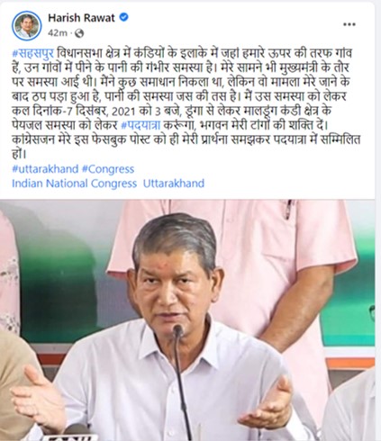 देहरादून। कांग्रेस के वरिष्ठ नेता और पूर्व मुख्यमंत्री हरीश रावत विधानसभा चुनाव के लिए सोशल मीडिया से लेकर धरातल तक जोर-शोर से सक्रिय हैं। कल (सात दिसंबर,2021) को रावत उस समस्या को लेकर पदयात्रा करेंगे, जो उनके मुख्यमंत्री रहते हुए भी सामने आई थी। यह बात रावत स्वयं स्वीकार करते हैं।