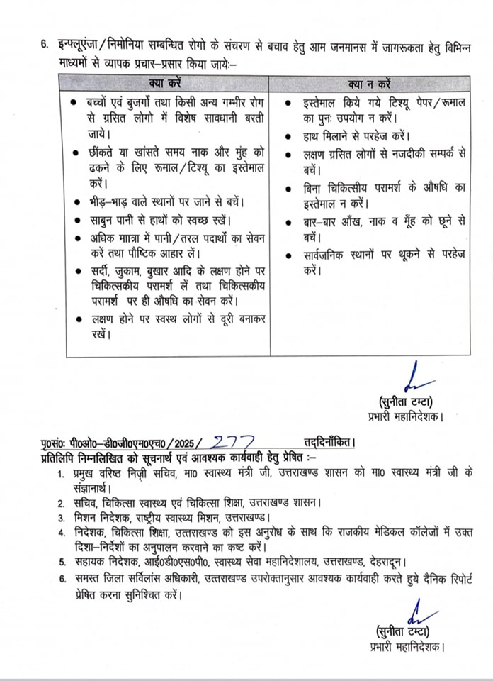 स्वास्थ्य विभाग, उत्तराखंड ने सीजनल इन्फ्लुएन्जा, ह्यूमन मेटान्यूमो वायरस (HMPV- Human Metapneumovirus) आदि श्वसन तंत्र सम्बन्धित रोगों से बचाव एवं रोकथाम के सम्बन्ध में दिशा निर्देश जारी किए हैं।