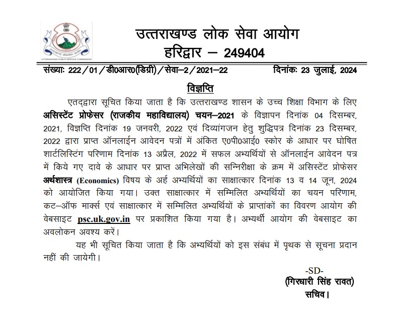 उत्तराखंड शासन के उच्च शिक्षा विभाग के लिए असिस्टेंट प्रोफेसर (राजकीय महाविद्यालय) चयन-2021 के तहत अर्थशास्त्र विषय के अर्ह अभ्यर्थियों का साक्षात्कार 13 और 14 जून, 2024 को आयोजित किया गया था।