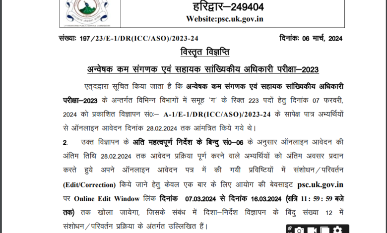 आयोग के अनुसार, ऑनलाइन आवेदन की अंतिम तिथि 28.02.2024 तक आवेदन प्रक्रिया पूर्ण करने वाले अभ्यर्थियों को अंतिम अवसर प्रदान किया जाता है। इसके तहत अभ्यर्थी अपने ऑनलाइन आवेदन पत्र में की गई प्रविष्टियों में संशोधन / परिवर्तन (Edit/Correction) किए जाने के लिए केवल एक बार के लिए आयोग की बेवसाइट psc.uk.gov.in पर Online Edit Window लिंक 07.03.2024 से 16.03.2024 (रात्रि 11: 59: 59 बजे तक) तक खोला जाएगा।